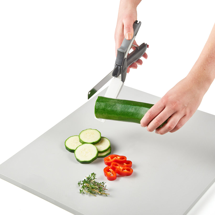 Prep fresh vegetables and herbs with a tool that feels natural in your hand. VITILITY’s vegetable and herb scissors combine a blade and a mini chopping board in one intuitive design. Place your ingredients between the scissor blade and the built-in board, then gently squeeze the ergonomic, soft-grip handles to chop. A spring helps the handles reopen after each cut so you can keep a steady rhythm without extra effort. It’s a compact, comfortable way to create quick cuts and everyday flavor—no separate cutting board or knife needed for simple tasks.